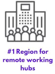 Ireland South East is the #1 region for remote working hubs. Since the pandemic this has become increasingly important as employees working from home at times require quieter office space. Remote working hubs allow employees and businesses to book desks, private offices, co-working spaces, and to network with others.